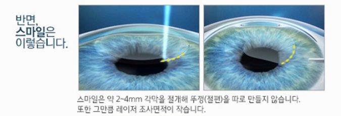 스마일 라식의 정식 명칭은 릴렉스 스마일라식으로 SMILE은 SMall incision Lenticyle Extraction, 각막 최소 절개술의 약어로 펨토초 레이저를 이용해 각막표면 안쪽의 실질을 깍아 굴절이상을 요정하는 수술입니다. 각막의 2mm의 최소 절개로 안구건조증, 각막혼탁, 원추각막증 등 기존 수술의 부작용 발생률이 낮은 수술 방법입니다.