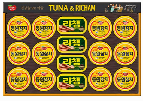 스팸 선물 세트와 더불어 선물세트 양대 산맥인 동원참치 선물세트의 구성은 동원 참치 12개와 리챔 4개로 구성되어 있습니다. 개인적으로 참치를 돈 주고 사 먹어 본적이 없는데 최근 참치 1캔을 돈 주고 사먹어 보니 생각보다 가격이 많이 비싸 놀란 기억이 있습니다.